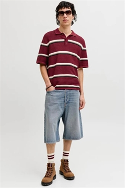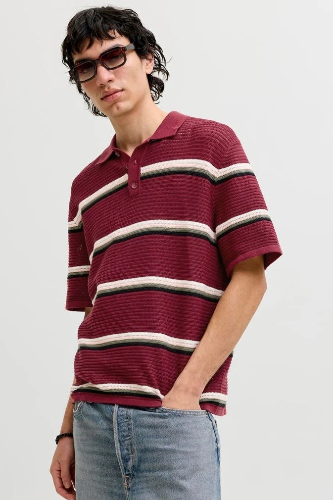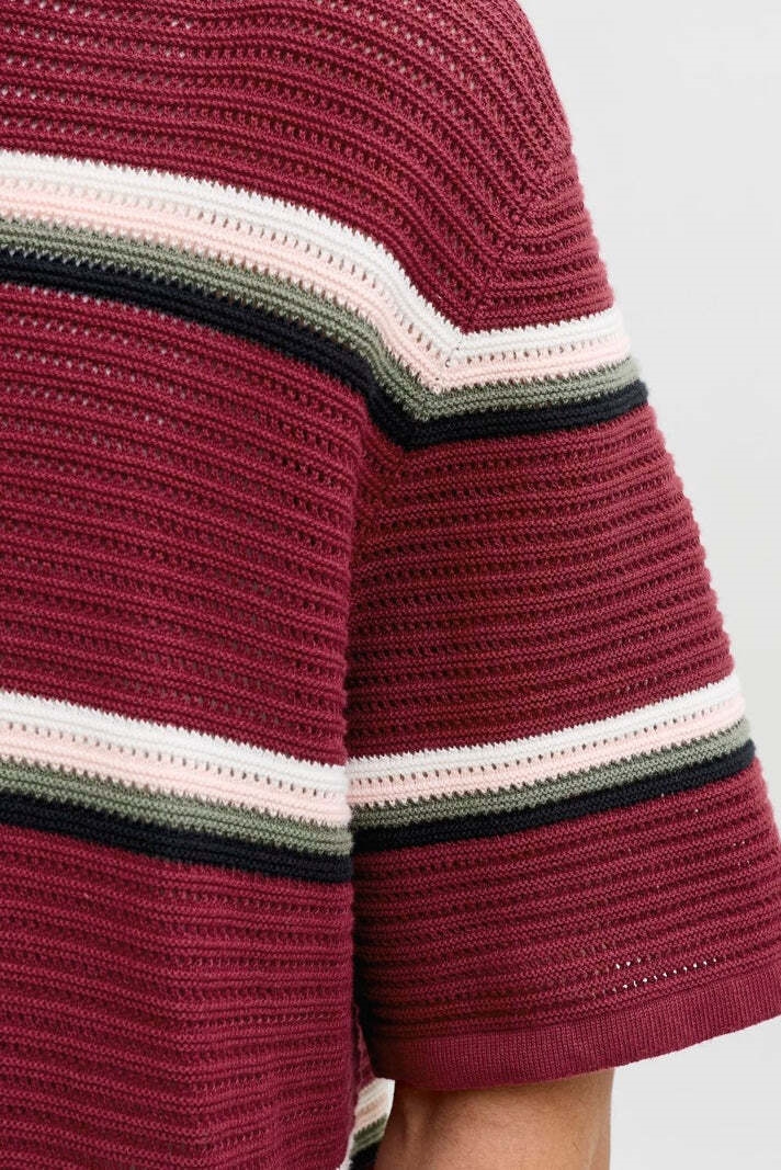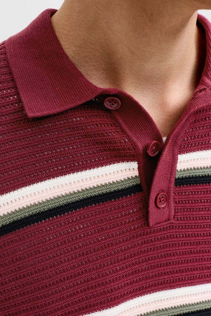 Denne stribede polo i strik tilbyder en afslappet pasform og kortærmet komfort, perfekt til et casual og stilrent look. Den er strikket i et blødt, åndbart materiale, der både sikrer fleksibilitet og komfort hele dagen. Farven Cabernet giver poloen et tidløst og maskulint udtryk, der let kan styles med både chinos eller jeans til hverdagsbrug.
