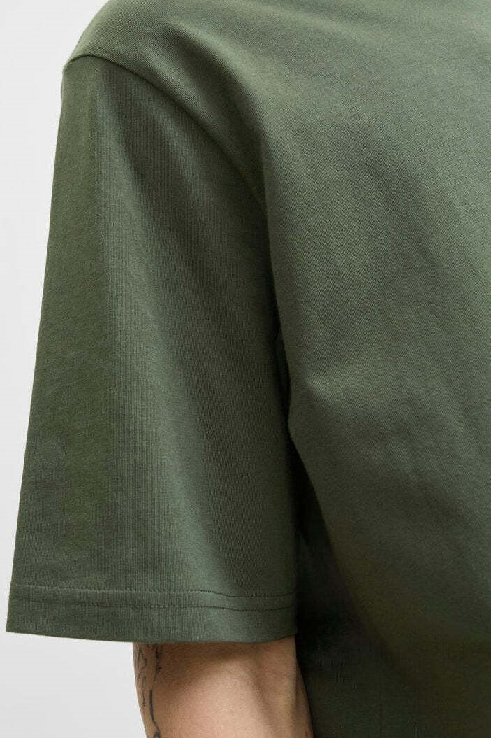 Denne tee har en afslappet pasform med kortere ærmer og en rund hals, der giver et klassisk og enkelt look. Stoffet består af 100% økologisk bomuld, som sikrer en blød og åndbar kvalitet, perfekt til både hverdag og mere afslappede anledninger. Den dybe, mørke grønne farve tilføjer et diskret strejf af farve uden at være prangende.