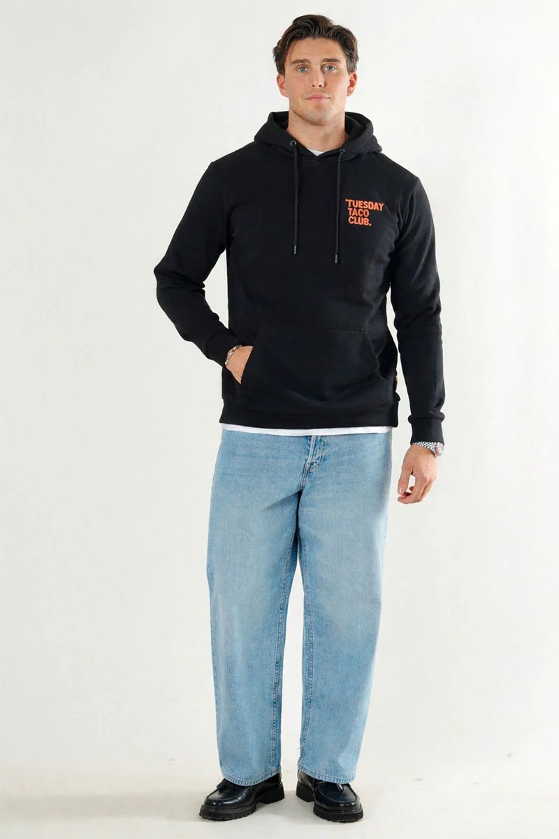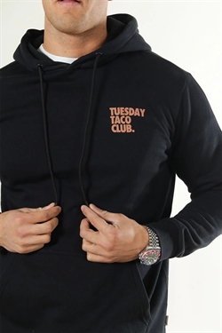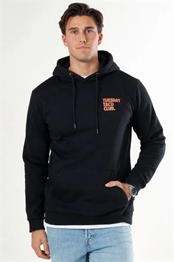 Denne Food Fiesta reg Hoodie byder på en afslappet pasform med lange ærmer og rund hals, der gør den komfortabel og alsidig til forårsvejret. Den er fremstillet af en blød blanding af 65% bomuld og 35% genanvendt polyester, hvilket sikrer både komfort og et mere bæredygtigt materialevalg. Den sorte farve med et unikt print kaldet "Tuesday Taco" giver sweatshirten et cool og casual udtryk.